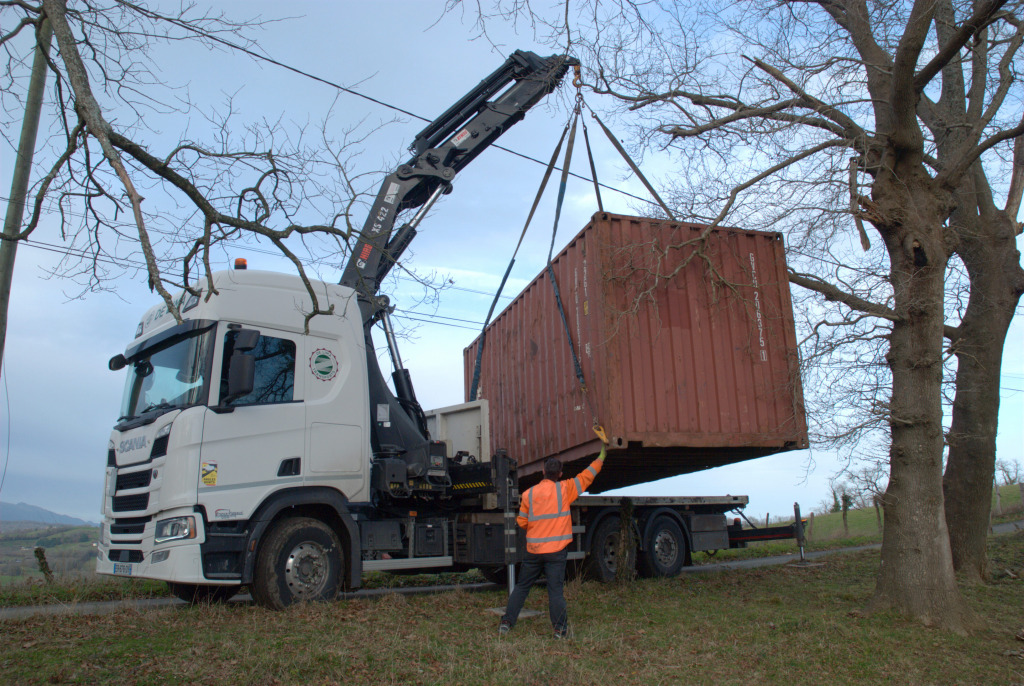 Vendredi matin, 8h. Comme le ciel rosit sur les Pyrénées, arrivée sur le terrain. Les branches : pas coupées. Légère angoisse – mais on se dit qu'on a deux heures pour trouver une solution. Sauf que l'échelle est trop courte. Sauf que l'élagueur ne décroche toujours pas. Sauf que... « Bonjour, je suis arrivé au début de votre chemin. » Le livreur de containers, qui a deux heures d'avance, avec son énorme camtar. Il confirme que les branches sont un souci. La panique commence à poindre : si on le fait revenir plus tard, on devra payer une nouvelle livraison, qui coûte presque aussi cher que le container. Et il est pressé : une autre livraison à faire ce matin.