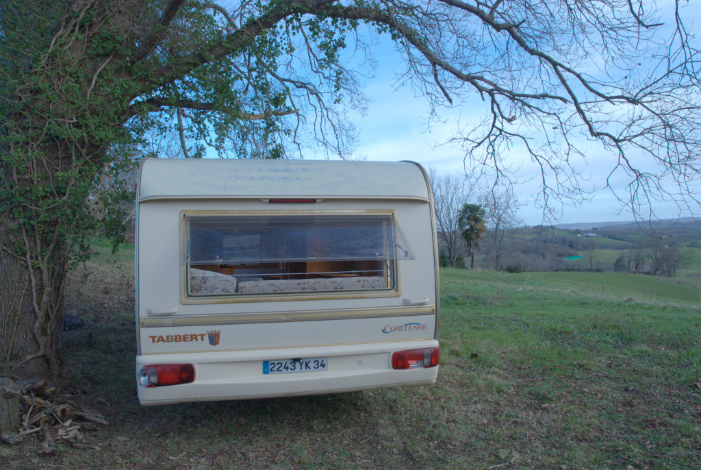 À peine le temps de souffler que débarque notre vendeur de caravane. En retard, lui... béni soit-il. Il la gare sous l'un des chênes épargnés, nous montre comment la stabiliser, et file.